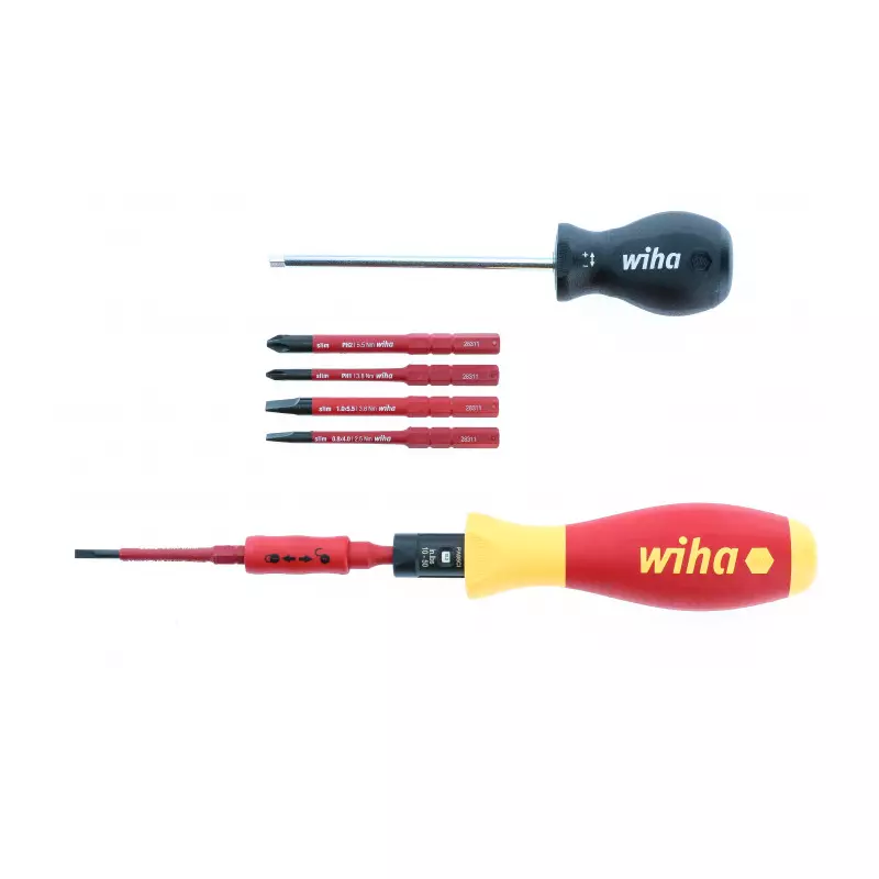 El Set 14 Pza Torquimetro Aislado 1000V para Tableros Electricos Wiha 28795-2 es una solución profesional diseñada para aplicar torque controlado y seguro en instalaciones eléctricas energizadas. Incluye un mango TorqueVario® VDE con rango ajustable y 13 puntas SlimBits aisladas en perfiles planos, PH, Xeno y Pozidriv, todo certificado para trabajar hasta 1000V AC según normas VDE / IEC 60900.
